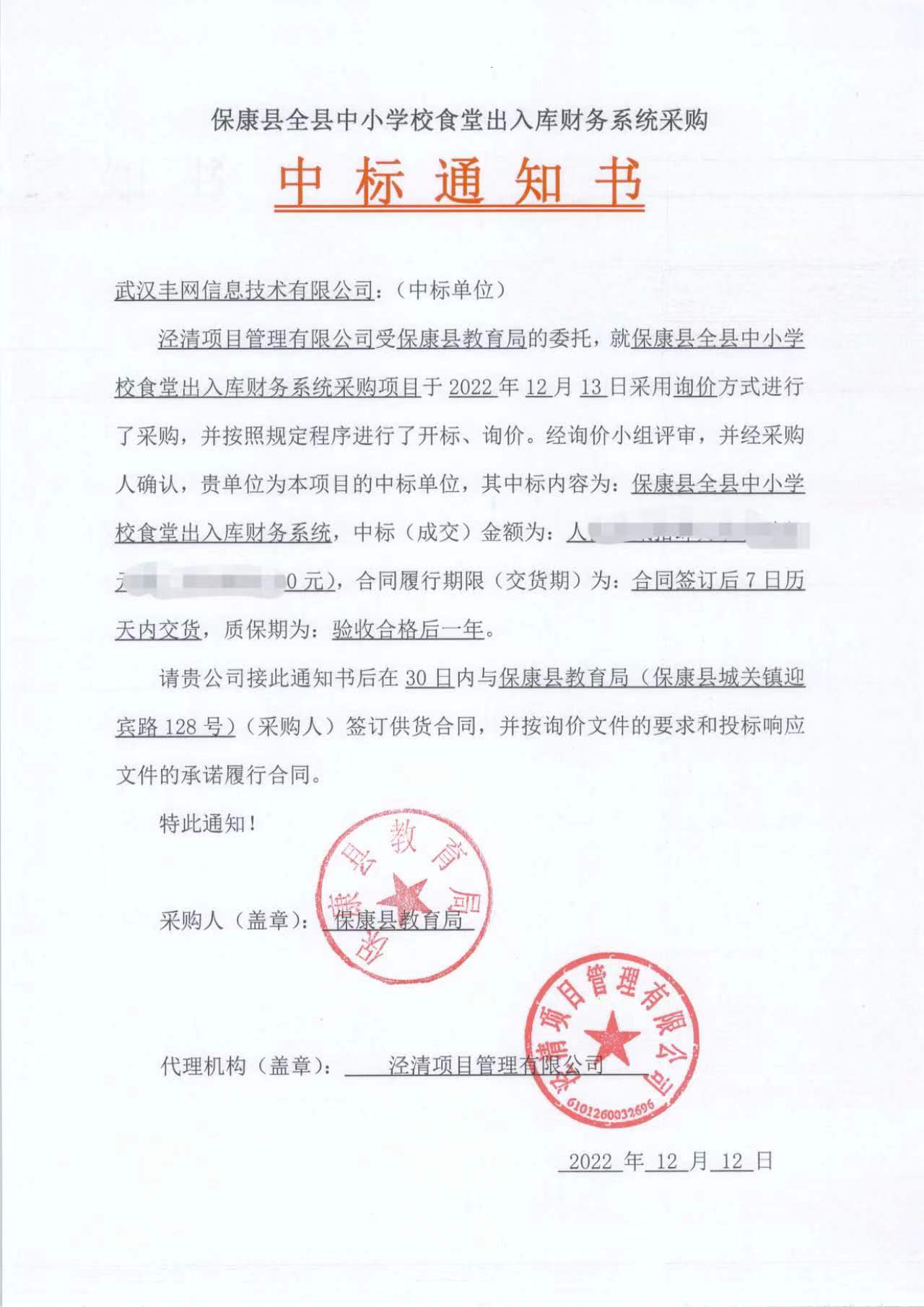 2022年12月12日,武汉丰网信息技术有限公司成功中标保康县学校食堂智慧管理系统项目!